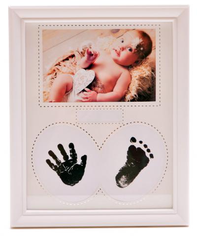 Бяла мулти рамка за снимка и място за отпечатък от краче и ръчичка на бебе. Комплектът включва мастилница за вземане на отпечатъците. Мастилото е безвредно и се почиства лесно. Рамката е с краче на гърба и фронт стъкло, изработена от PVC материал. Рамката е подходяща за снимка с размери: 10х15 см.