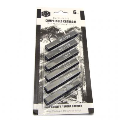 Комплект от шест броя пресовани въглени за рисуване. Въглените са с различна твърдост: 2 броя soft, 2 броя medium и 2 броя hard. Подходящи за фини линии и широки щрихи. Размери: 6.5х1х1 см.
