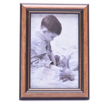 Рамка за снимки със златист вътрешен кант. Рамката е с фронт стъкло и има гръб с поставка за хоризонтално и вертикално поставяне. Подходяща за снимки с размери 10х15см.