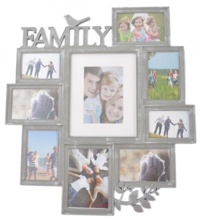 Стилна рамка за 9 снимки с надпис - Family. Цвят: сив. Подходяща за съхранение на семейни снимки по Ваш избор или като оригинален подарък. Изработена от PVC материал с фронт стъкло и гръб с кукички за окачване. Размер на рамката: 60 х 52 см. Подходяща за снимки с размери: - 2 бр: 8 х 12 см, - 5 бр: 10 х 15 см, - 1 бр: 13 х 18 см, - 1 бр. 20 х 25 см.